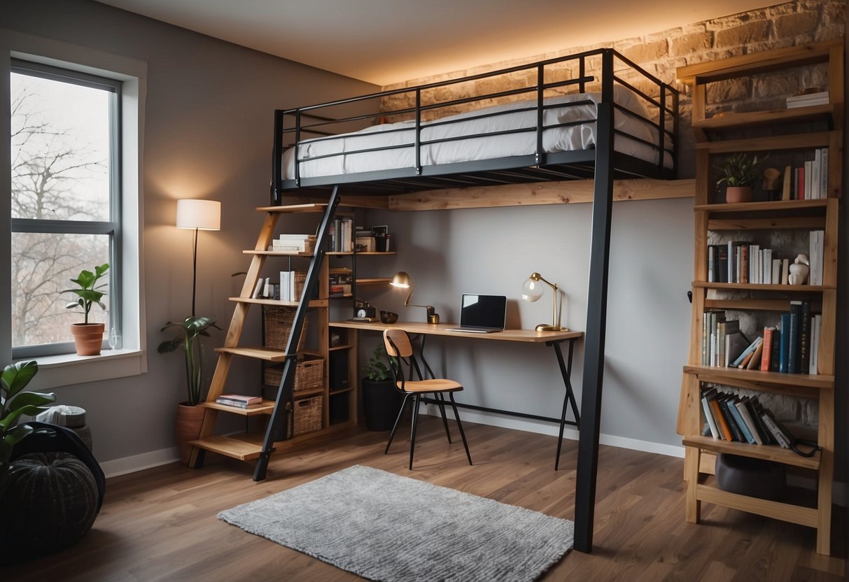 A loft bed stands against a wall, with a desk and bookshelf underneath. A ladder leads up to the bed, which is surrounded by a safety railing