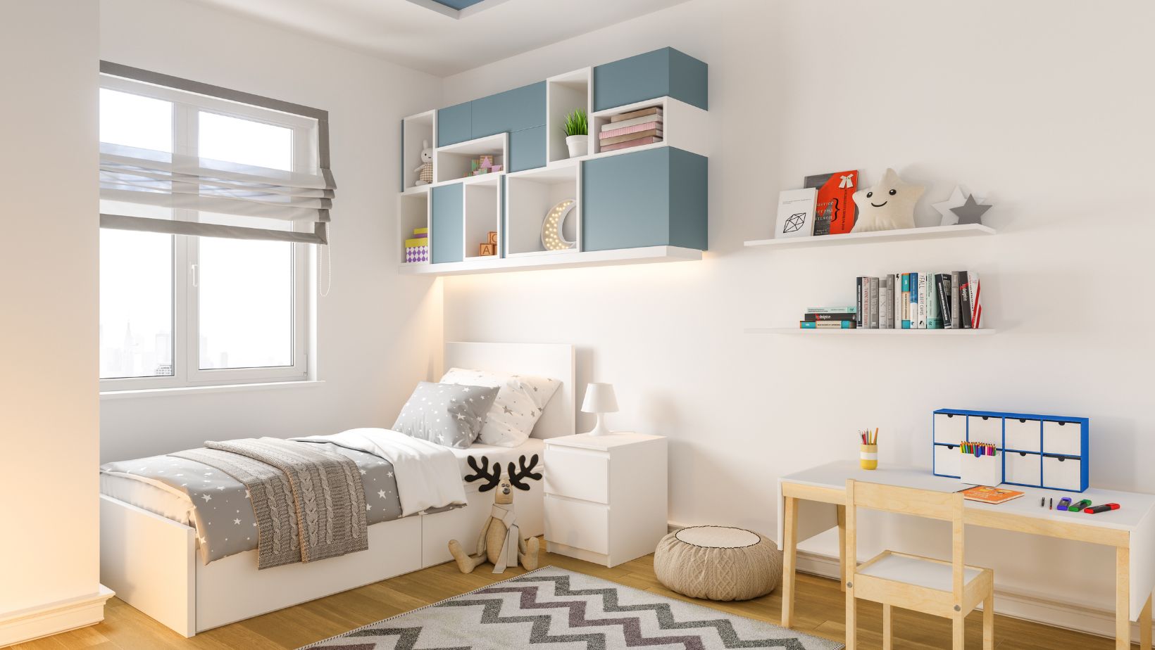 Colour coordination plays a huge role in setting the room’s tone. While it might be tempting to use a rainbow of bright colours, a more sophisticated approach is to choose a primary palette of two or three complementary colours and use them consistently. You can add pops of brighter colours through accessories like cushions, rugs, or storage bins. Natural tones from wooden furniture can provide a calming base for your colour scheme.